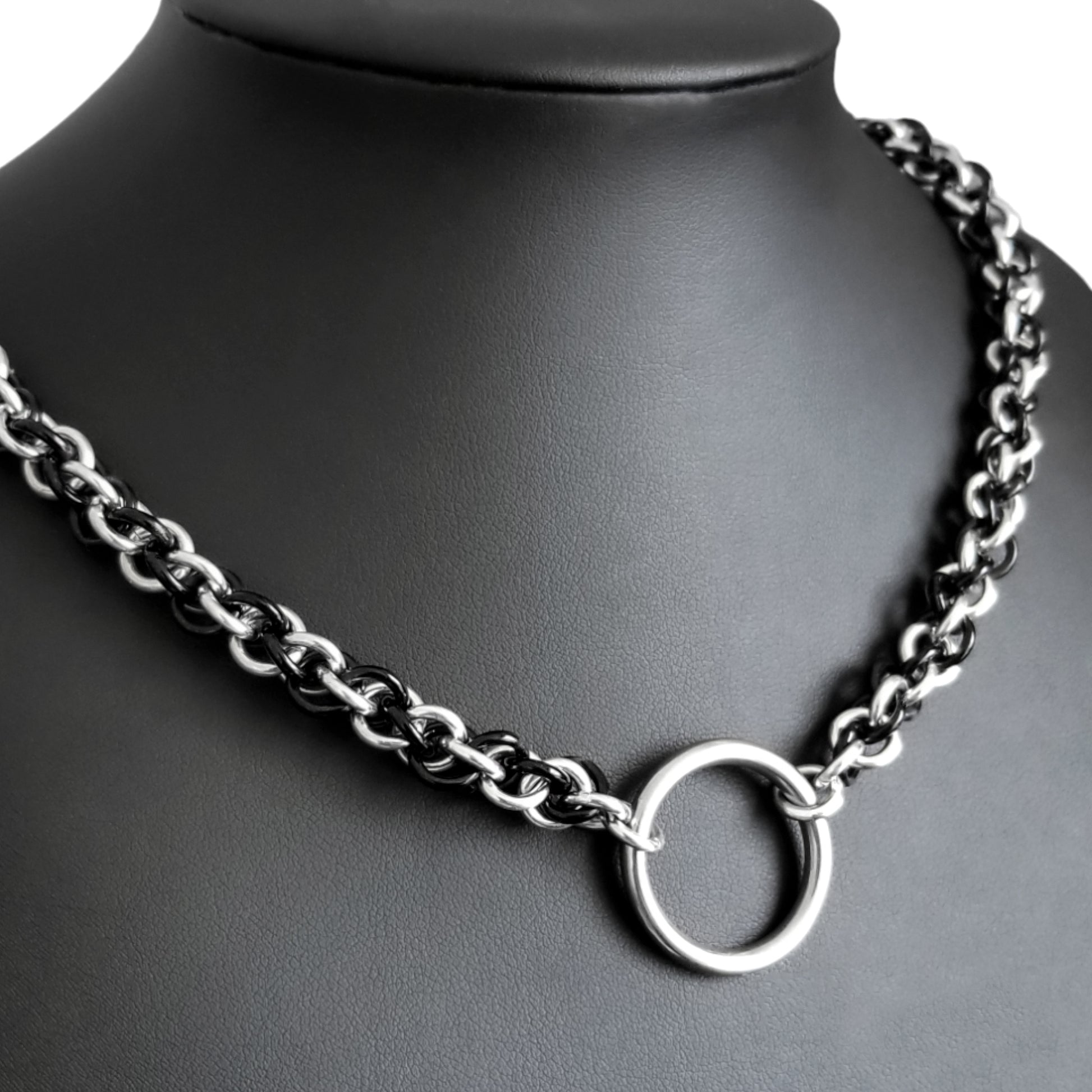 This is a stunning chain that easily transitions from casual day-time wear to night-time formal wear, is super lightweight, and is extremely easy to care for. The chain, consisting of alternating bright aluminum rings & black anodized aluminum rings, has been handcrafted into a beautiful JPL3 spiral chainmaille weave and attached to a 25mm solid stainless steel O ring. Chain clasps in back with 12mm stainless steel lobster claw and 2" extension chain. Choose from 2 lengths, 16-18" or 18-20".