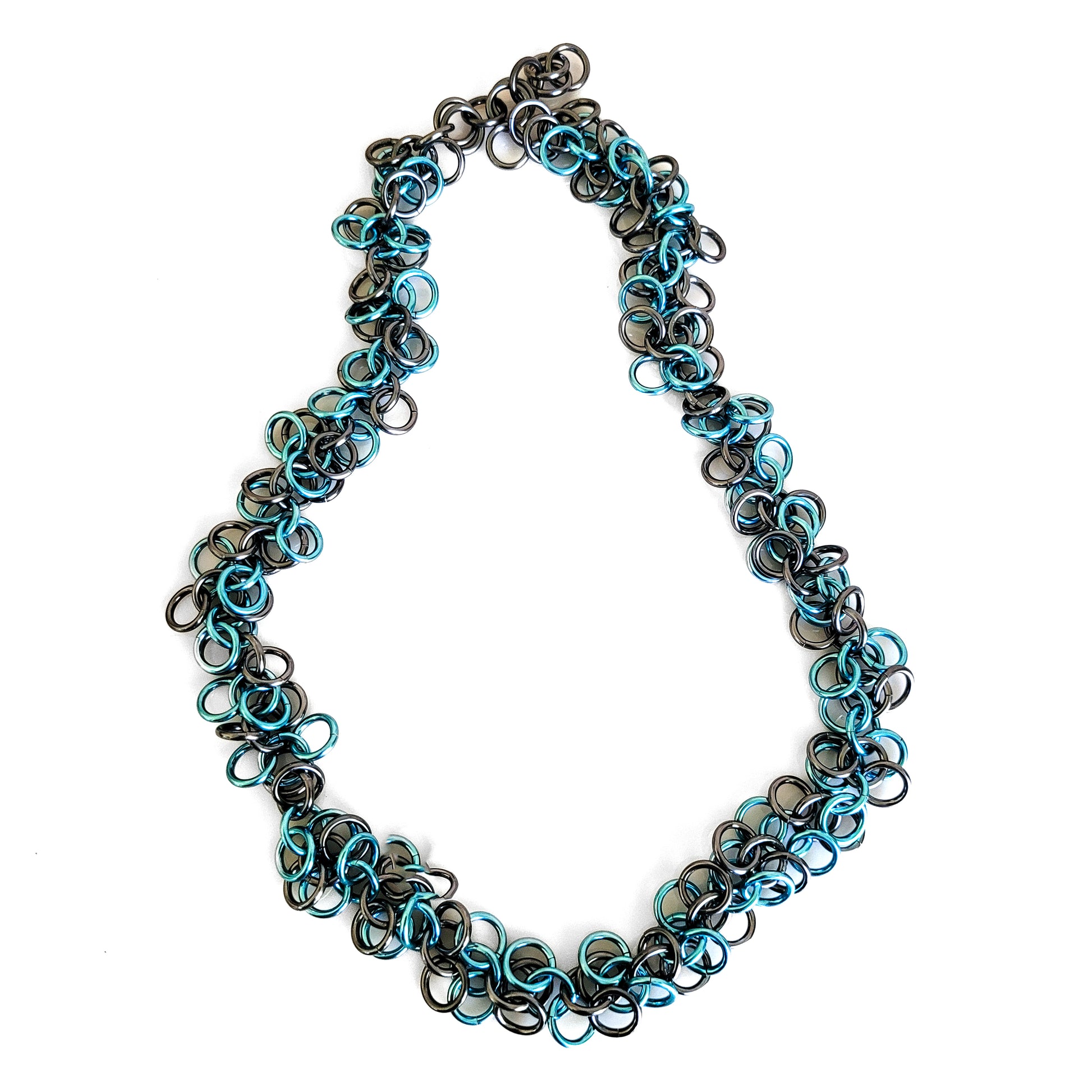 The amazing color combination of Sky Blue & Black Ice in this Shaggy Loops chainmaille necklace is the perfect casual to formal piece for Spring & Summer. It's fluid & slinky, as well as beautiful, lightweight, & easy to care for! Featuring a mix of anodized aluminum rings in alternating Sky Blue & Black Ice, and a stainless steel lobster claw closure.