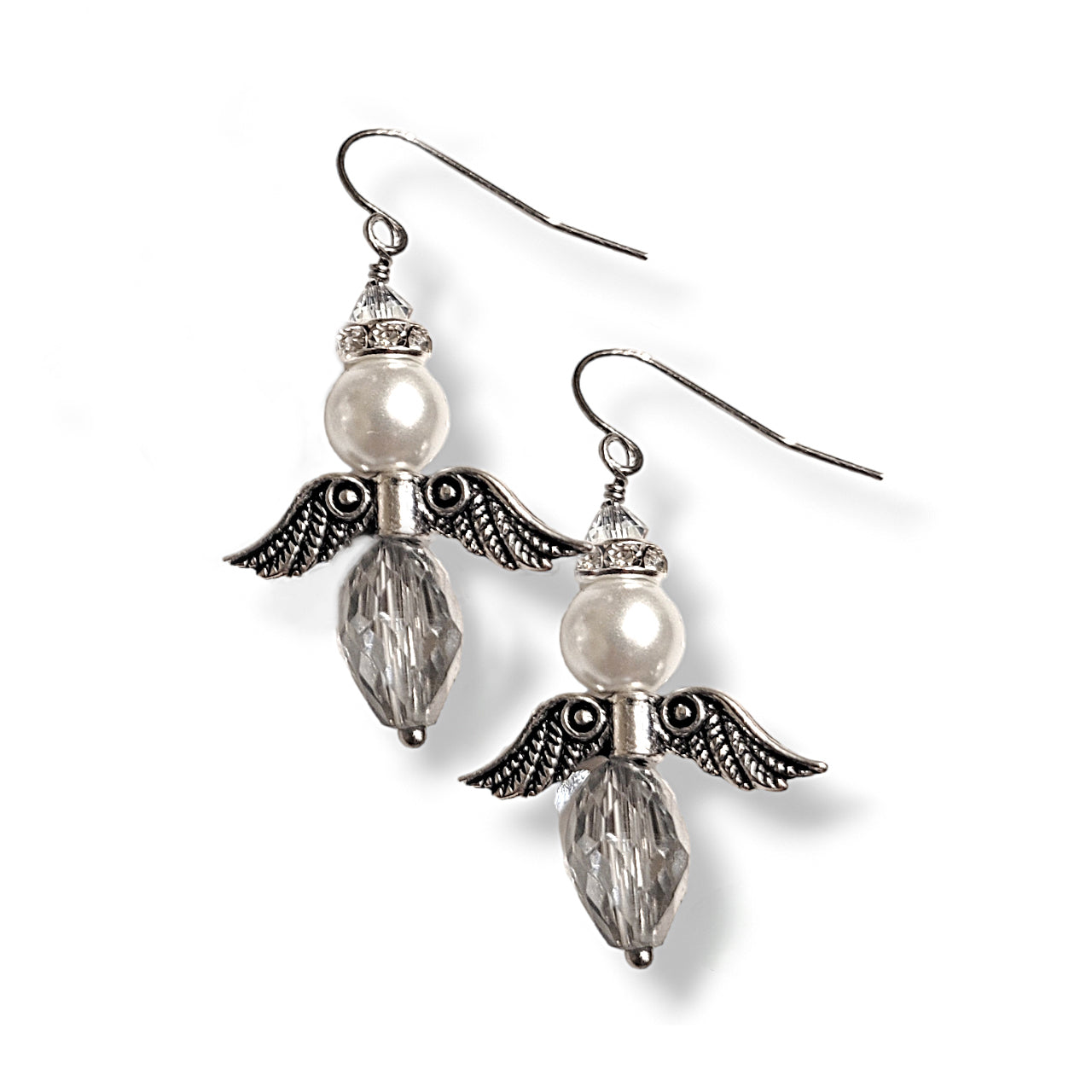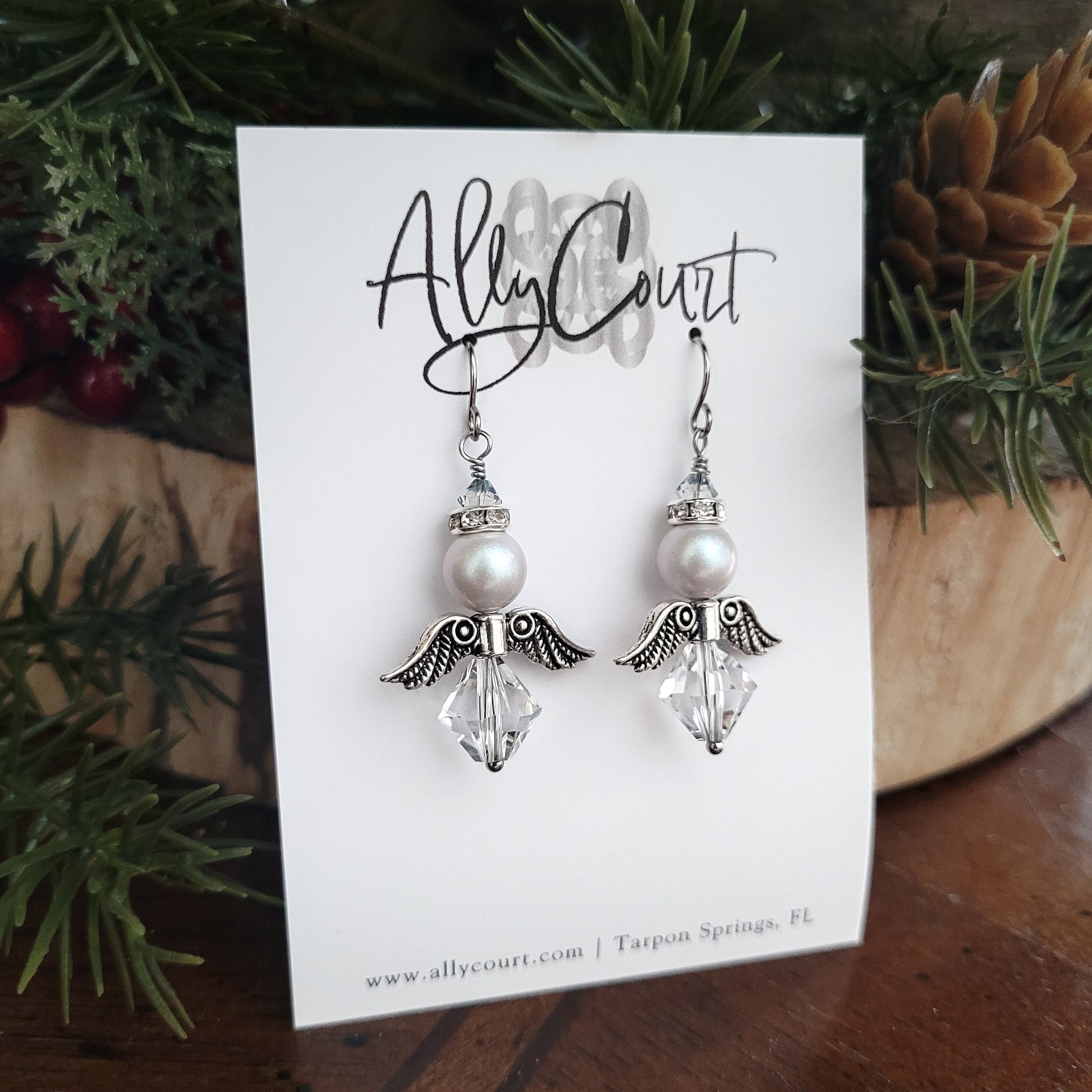 Just in time for the holidays, these beautiful crystal Angel earrings have been handcrafted from Swarovski crystals & pearls, Czech glass rhinestone rondelle beads, and angel wings. Each pair of earrings have an approximate drop of 1 3/4" from the top of the stainless steel ear wire, and are shipped in a black drawer-style jewelry gift box for easy gifting to all your favorite people! ***Choose from 3 Versions: