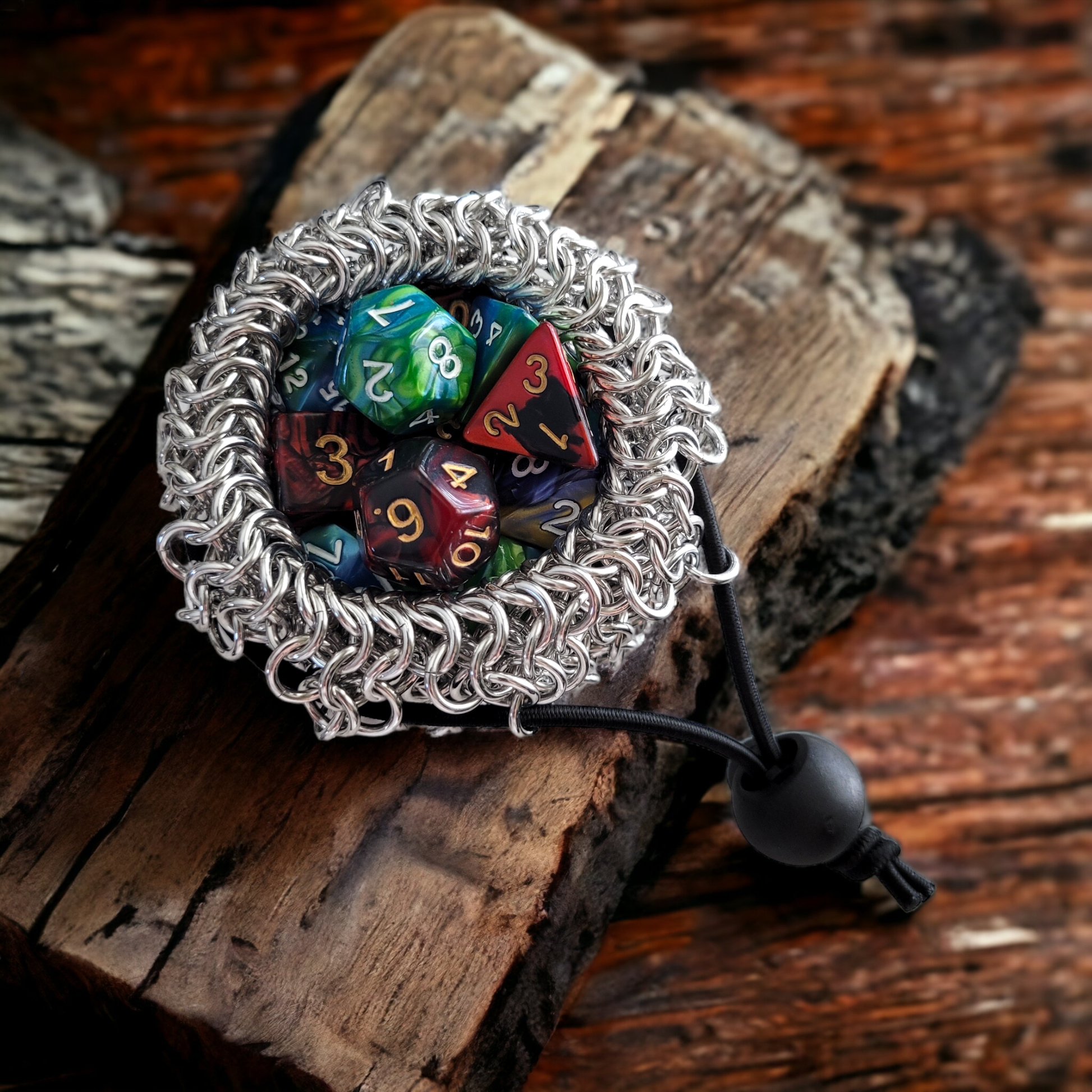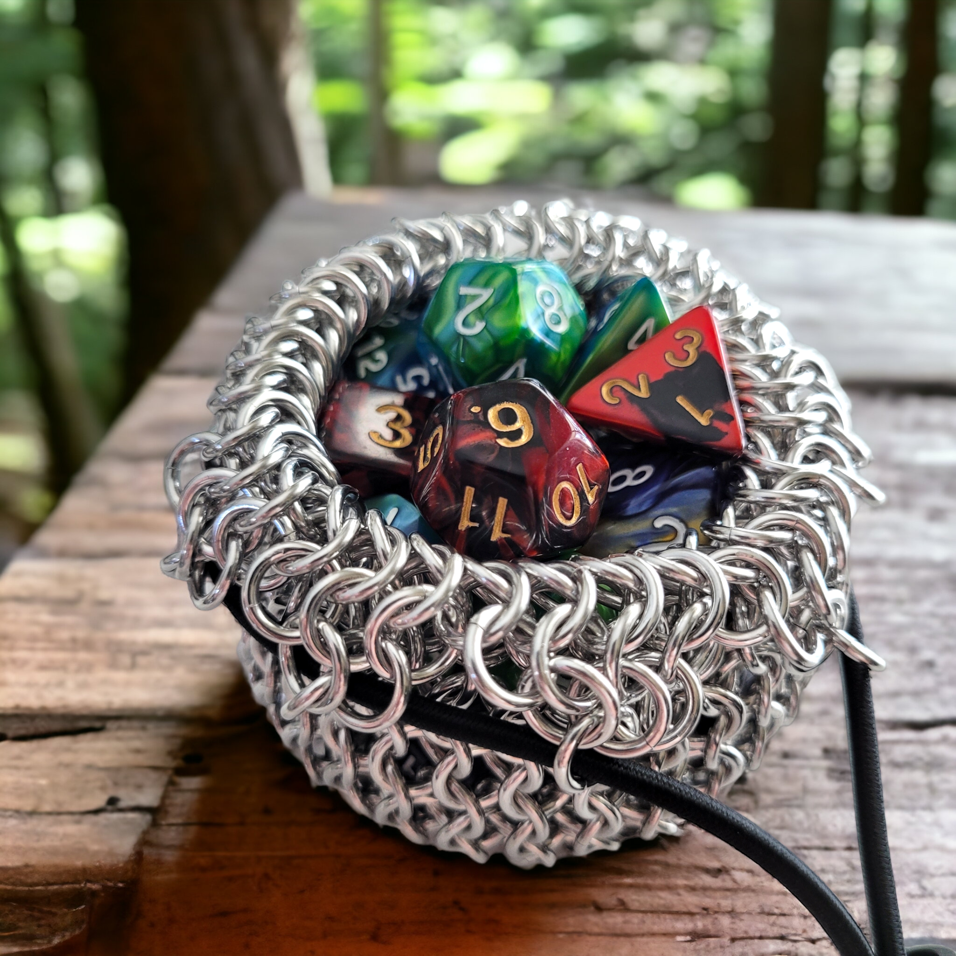 Handwoven from 16 gauge bright aluminum rings, this Euro 4 in 1 chainmaille dice bag holds 3 full sets of standard DnD dice comfortably...but of course you can use it to hold anything you see fit! When full, this bag measures approximately 3"x 3" with a circumference of 9 1/4". Bag lays flat when empty. **Dice not included**