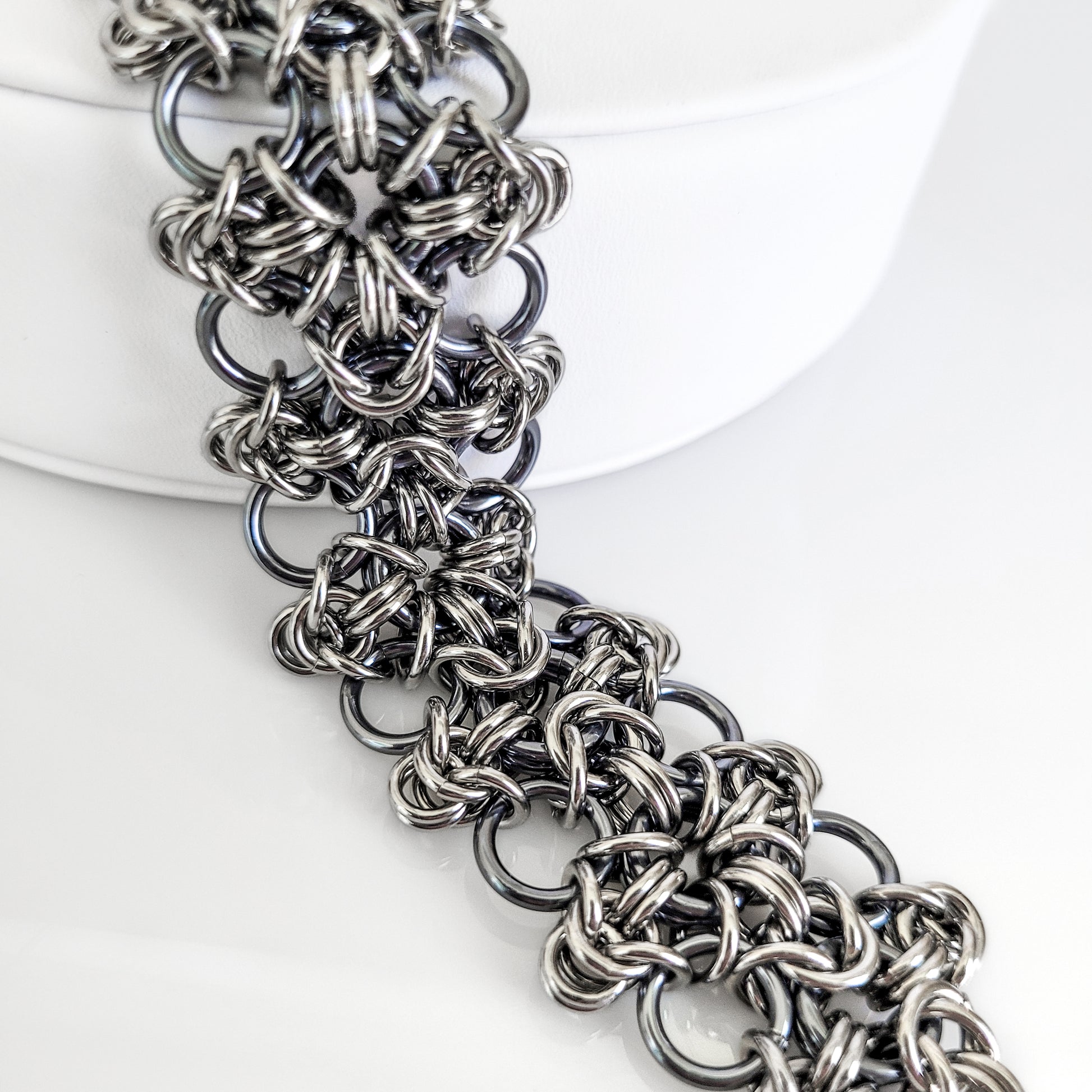 This stunning bracelet features 2 different chainmaille weaves, Japanese Lace & Byzantine, which have been woven from Stainless Steel rings and connected together with Black Ice aluminum rings. This is a beautifully fluid piece that has a nice weight to it, and is clasped with a large 15mm stainless steel lobster claw clasp. Contact me to request a custom order if you are interested in a different size.