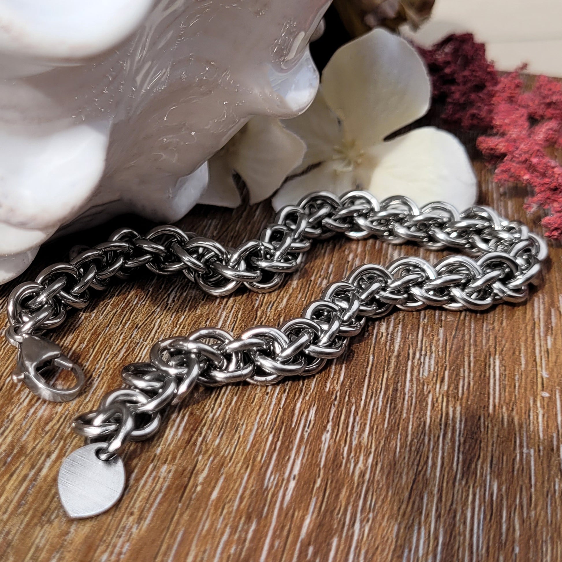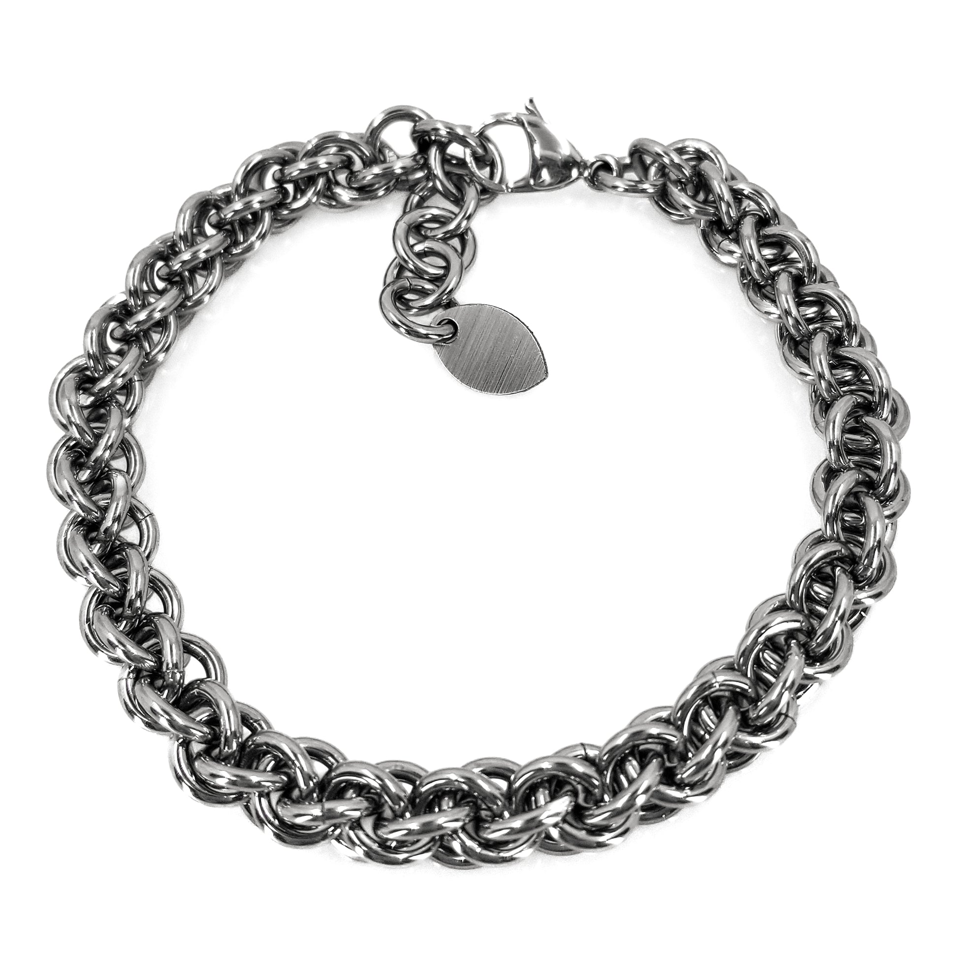 This all stainless steel 16 gauge chainmaille bracelet is the perfect addition to your every-day wear staples. Jens Pind Linkage is a strong, yet simple spiral weave, that transitions well from casual to formal. With the ease of care of stainless steel, this piece will be treasured day in and day out!
