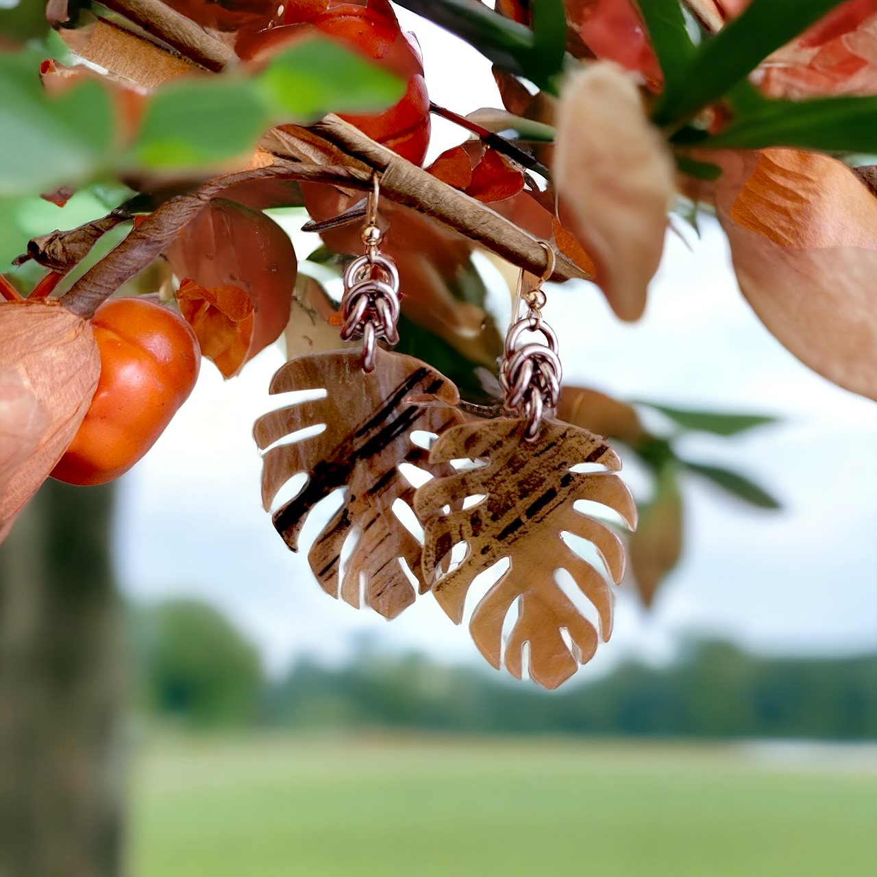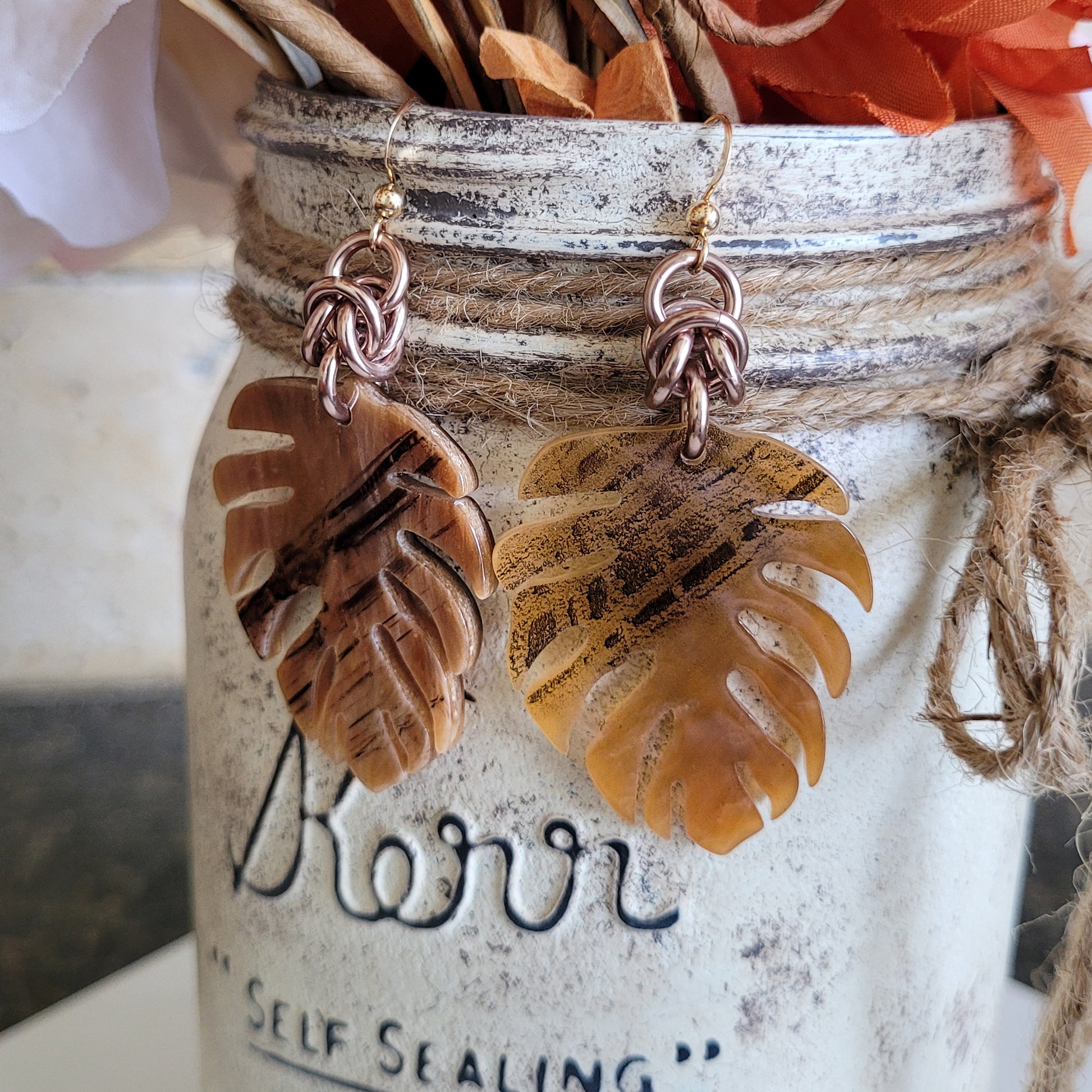 Gorgeous hues of honey, caramel, & chocolate have been swirled together with black and cream streaking, giving each of these acetate Monstera Leaf pendants a unique & one of a kind look that may vary slightly from piece to piece. The beautiful caramel focal leaf is attached to a unit of Byzantine weave and dangles from a 14k gold filled French hook ear wire.