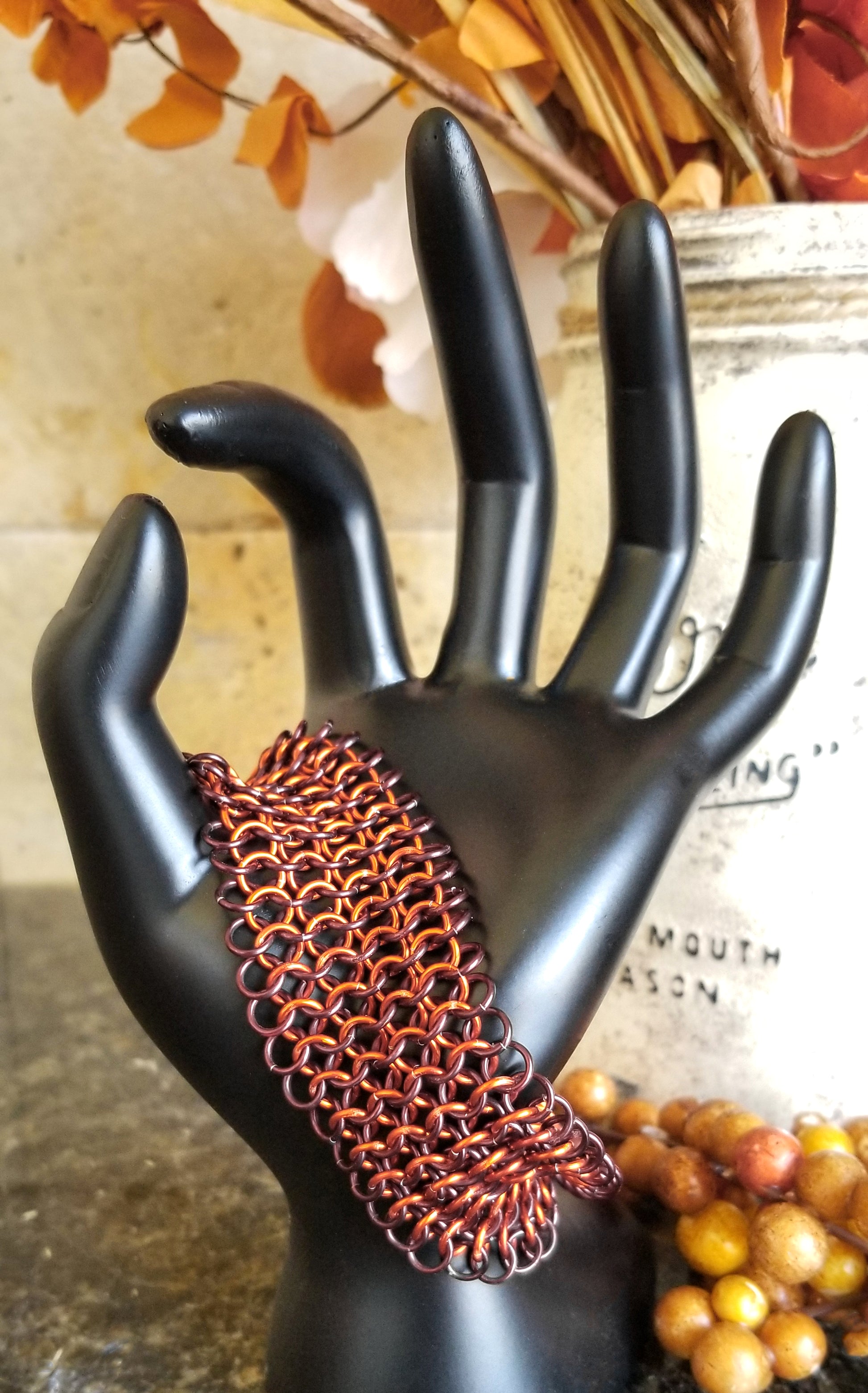 Gorgeous fall colors abound in this slinky Euro 4 in 1 chainmaille cuff bracelet, created from anodized aluminum rings in Paprika & Chocolate. Super lightweight & easy to care for, with a stainless steel tube slide clasp.
