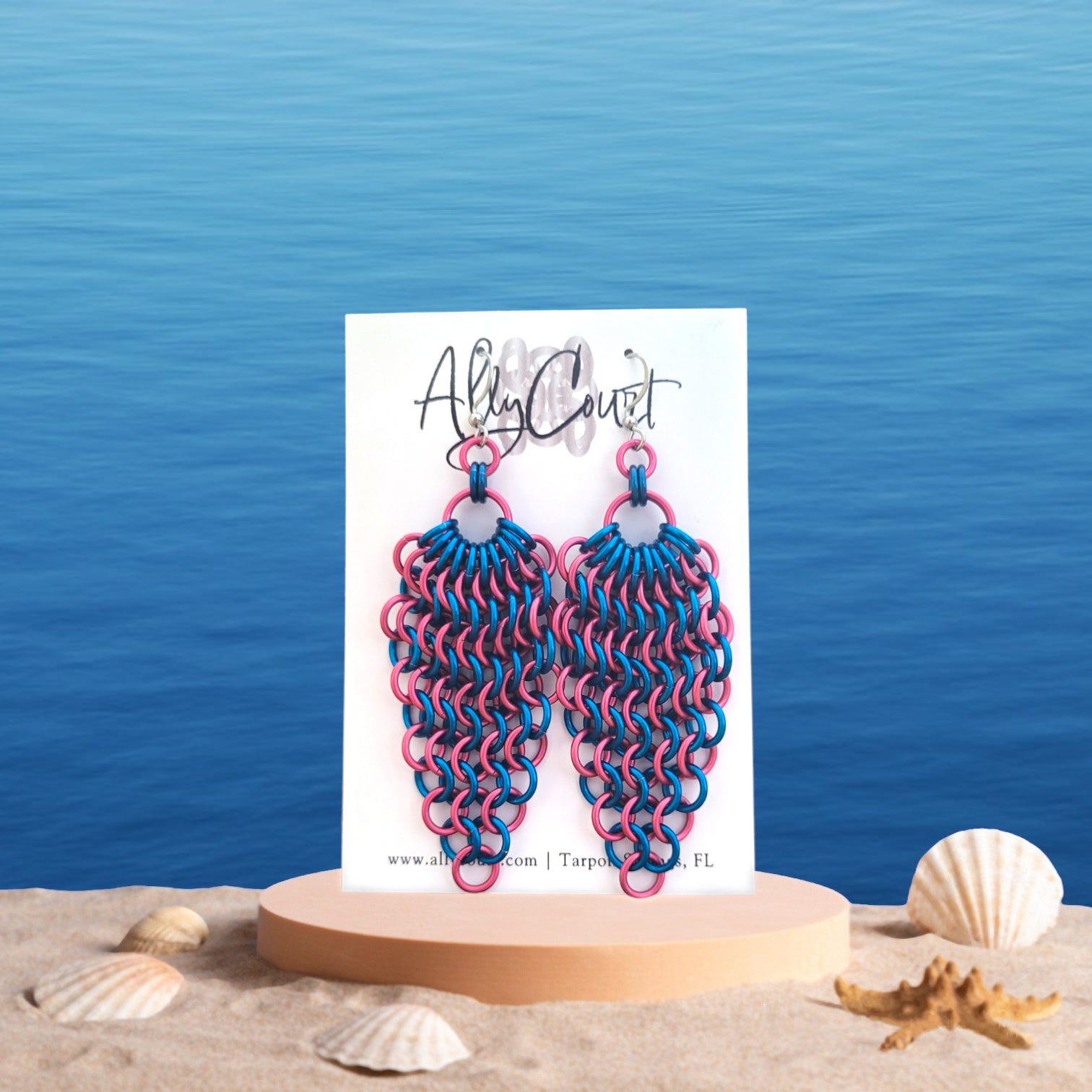These fun, colorful, & eye-catching earrings are amazingly lightweight despite their size! Pink & blue anodized aluminum rings have been woven together in a European 4 in 1 chainmaille weave to create these slinky pair of earrings with plenty of movement & color, just in time for Spring!