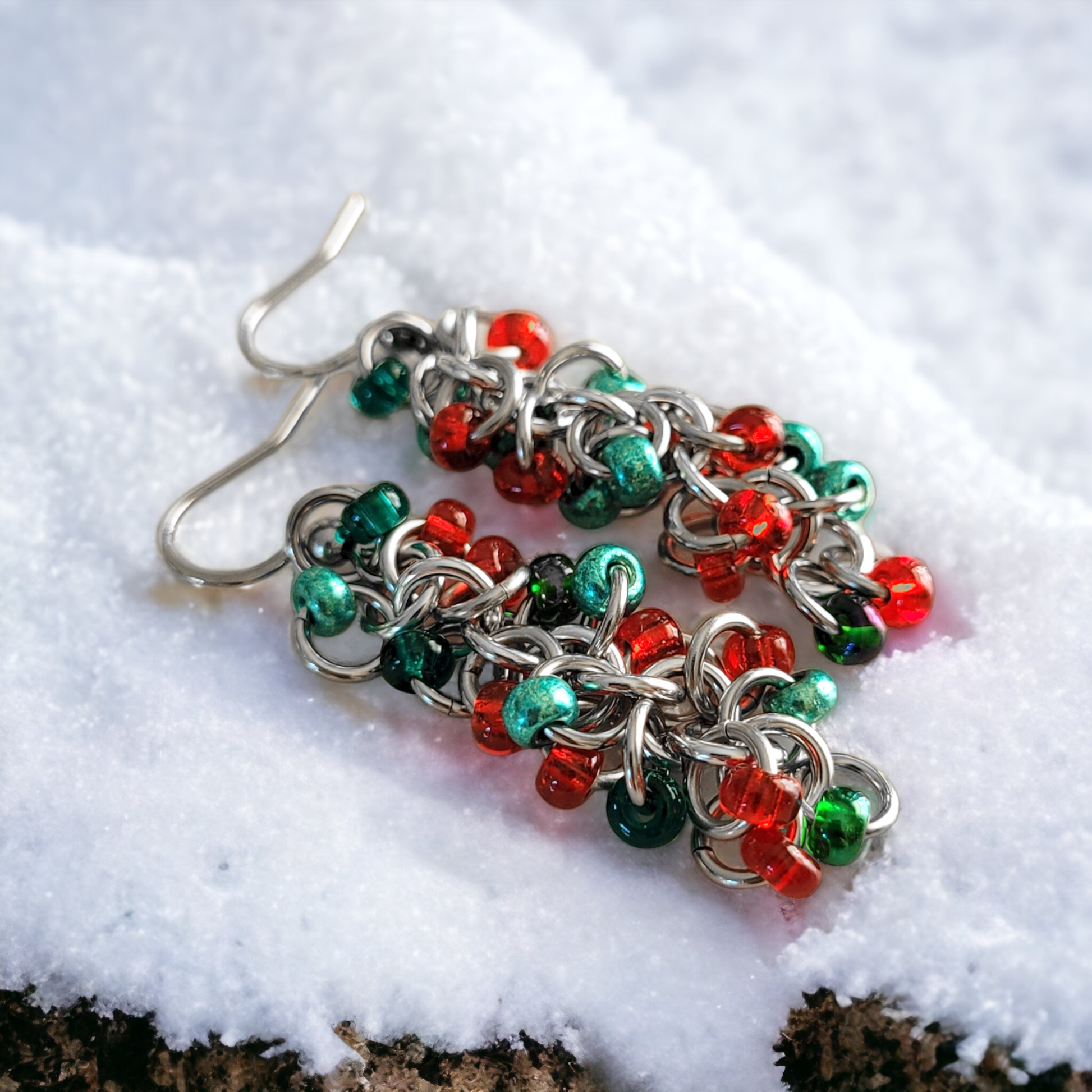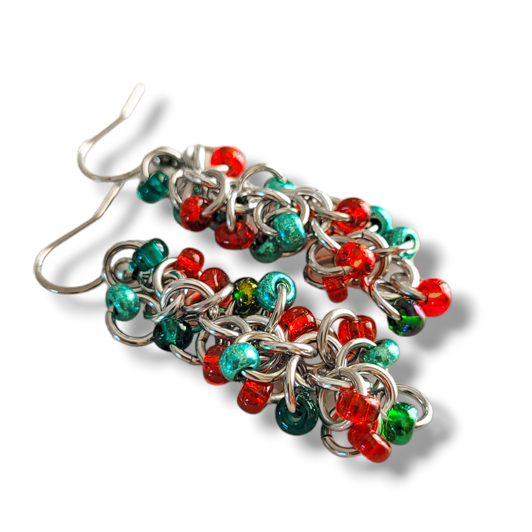 Get into the holiday spirit with these beautiful, lightweight & playful beaded shaggy loop dangle earrings, handcrafted by carefully weaving red and green Czech glass seed beads onto bright aluminum rings...perfect for the Christmas season...and then all year round!