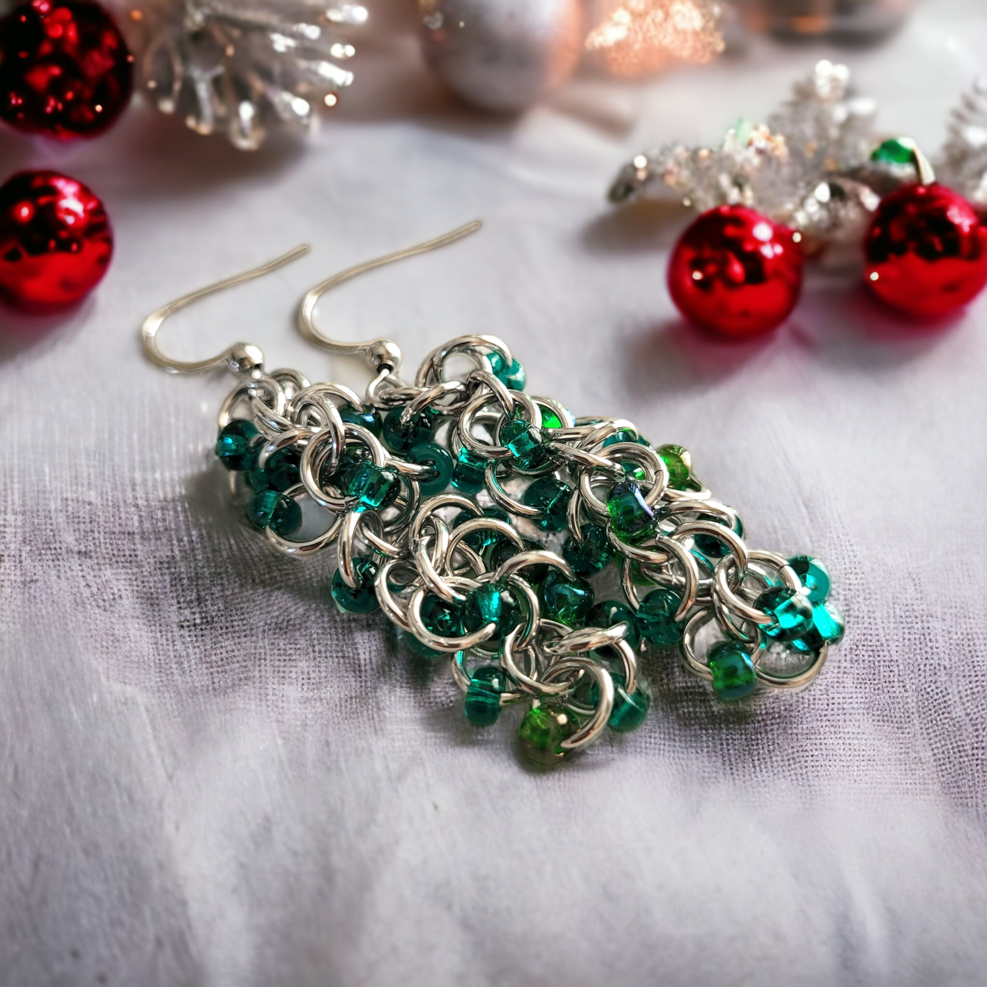 Emerald green Czech glass seed beads, reflecting various shades of green, have been carefully woven onto bright aluminum rings to create these playful shaggy loop dangle earrings. These lightweight eye-catchers are sure to become a go-to fave! All earrings are shipped in a black drawer-style jewelry gift box.