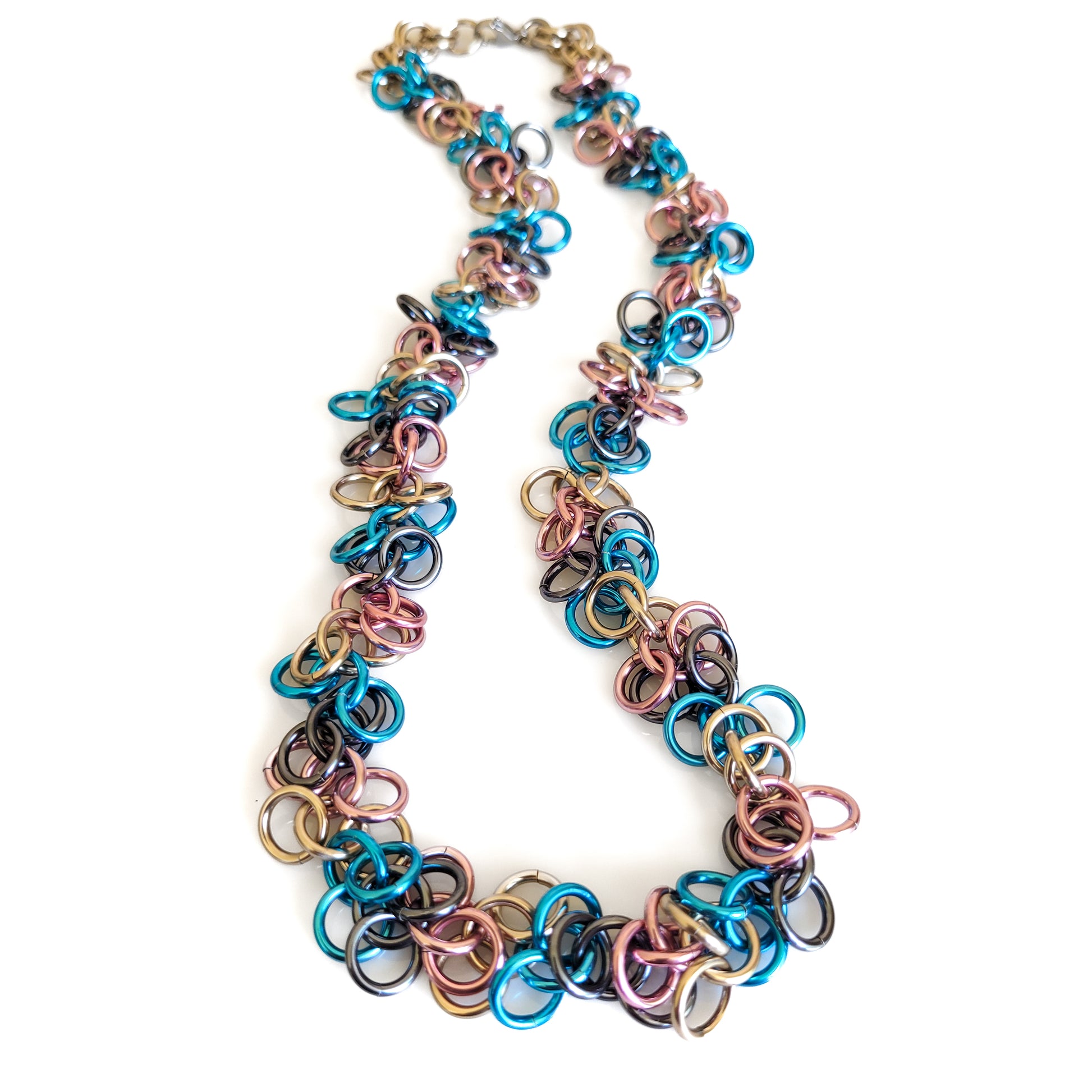 Step into Spring with all of the color and none of the weight when you show up in this fun and flirty shaggy loops chainmaille necklace. Featuring a Spring mix of anodized aluminum rings in alternating pink, champagne, turquoise, & black ice, making it so easy to care for. Pair it with the matching earrings!
