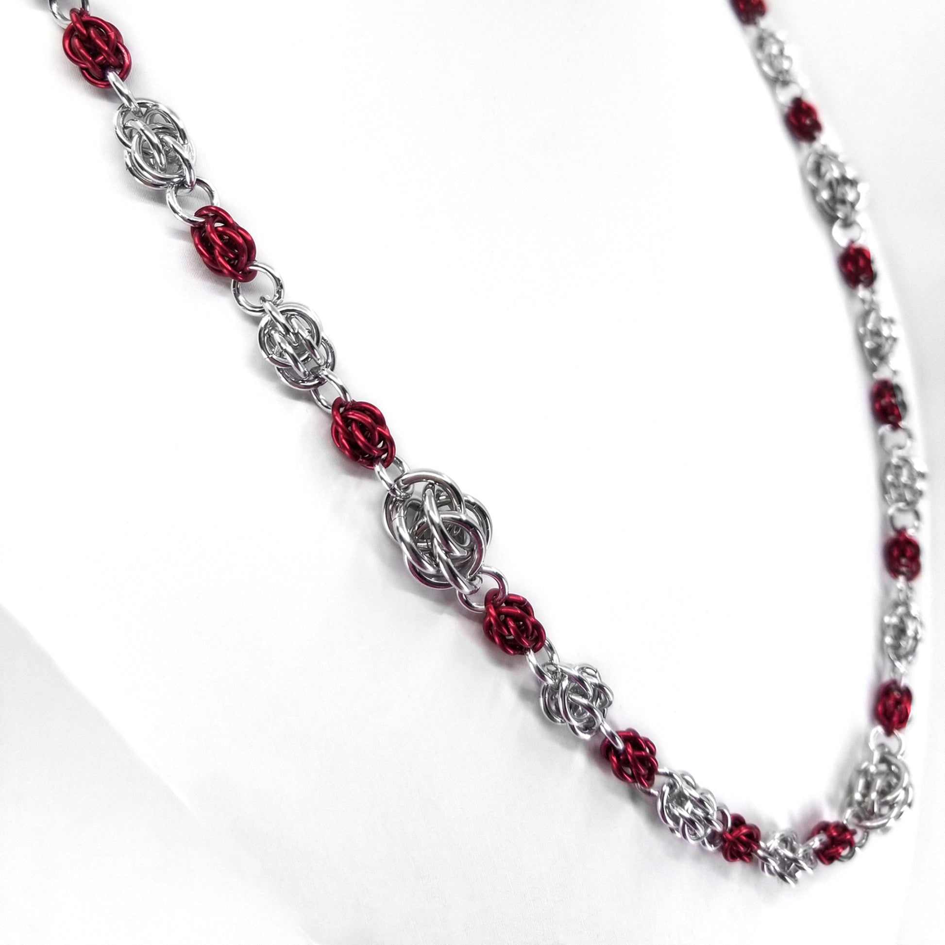 Over 300 rings in alternating bright aluminum and marsala red have been intricately woven together to create this elegant Sweet Pea chainmaille weave necklace.