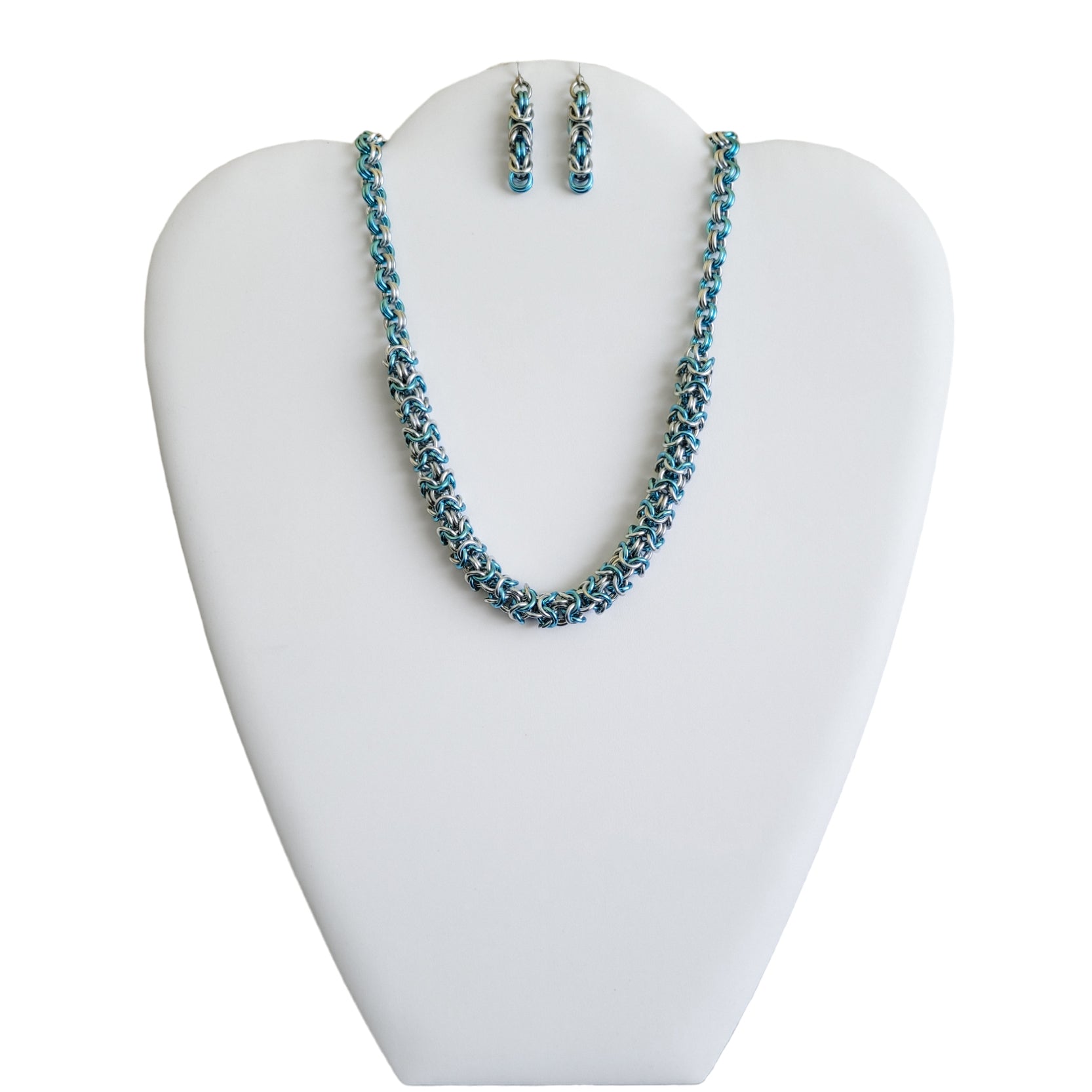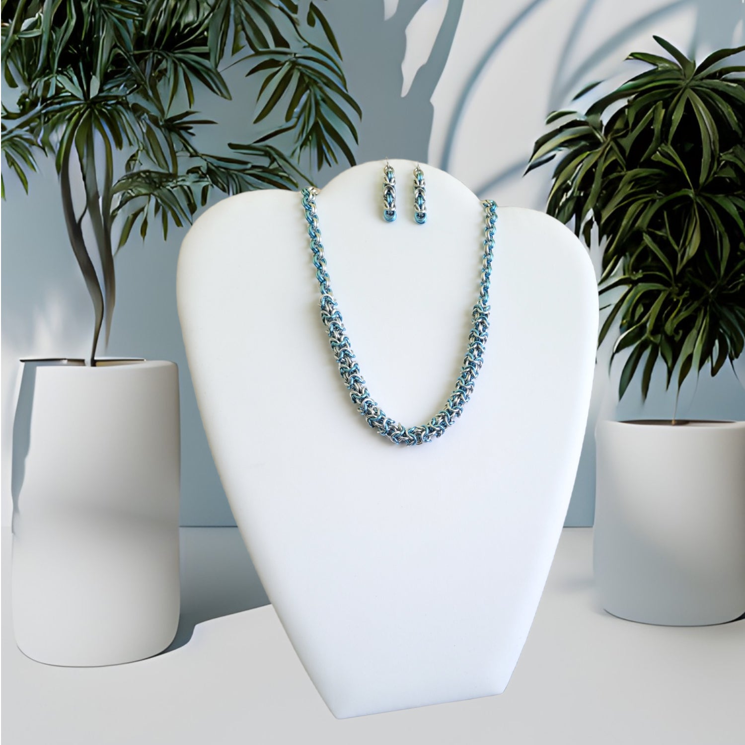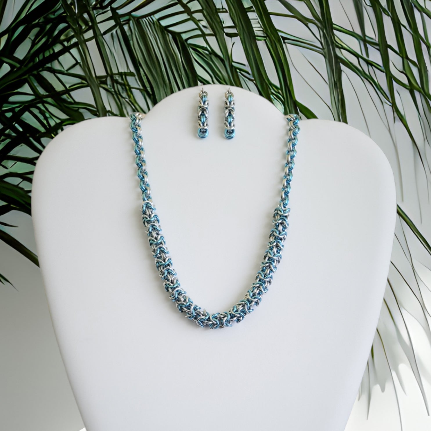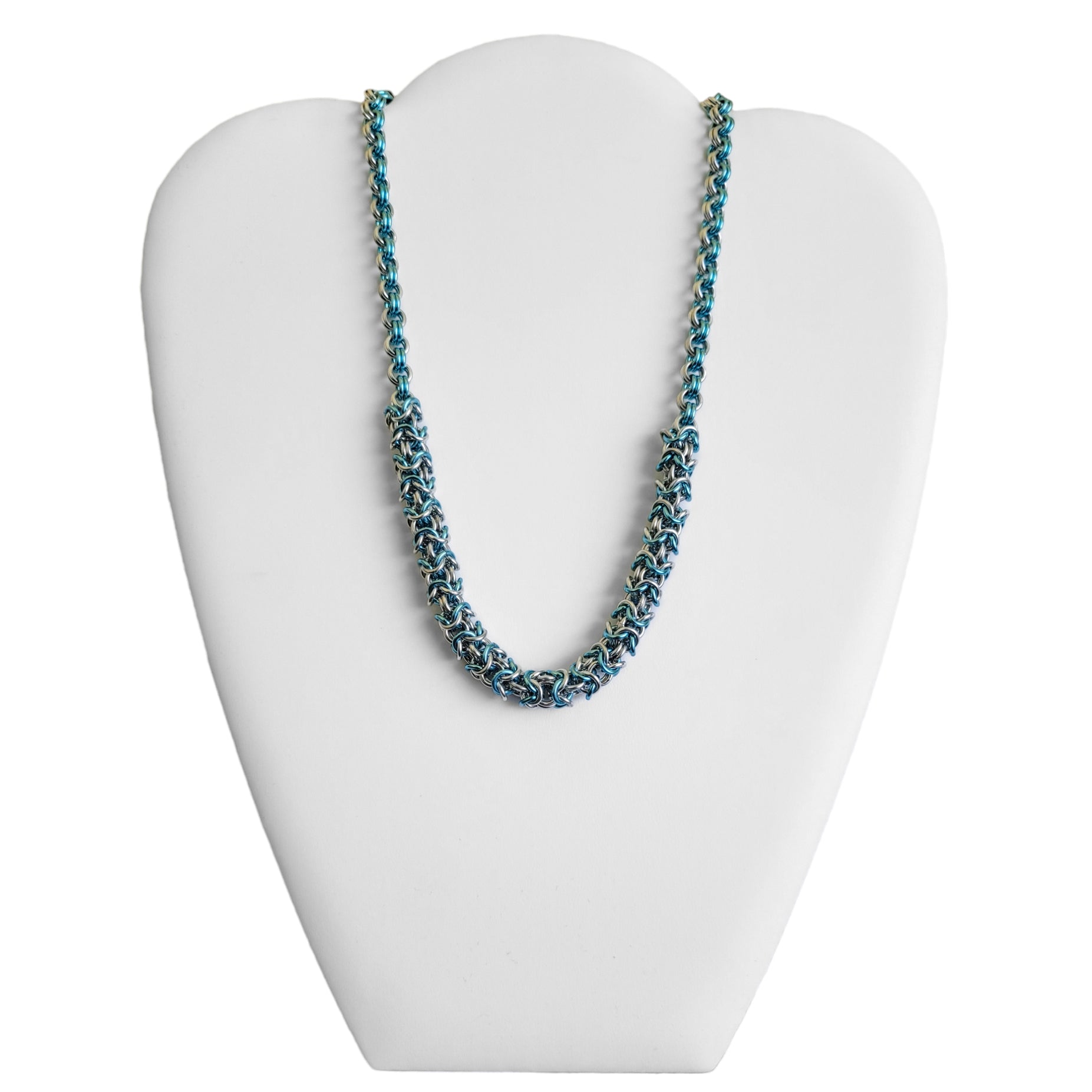 A unit of Turkish Roundmaille, woven from sky blue anodized aluminum and bright silver aluminum, has been attached on each side to a 2x2 chain to create this uniquely stunning necklace. Perfect for spring and summer! This piece is not only beautiful, it's also lightweight, and easy to care for. Pair it with with a set of matching earrings in a Byzantine weave!