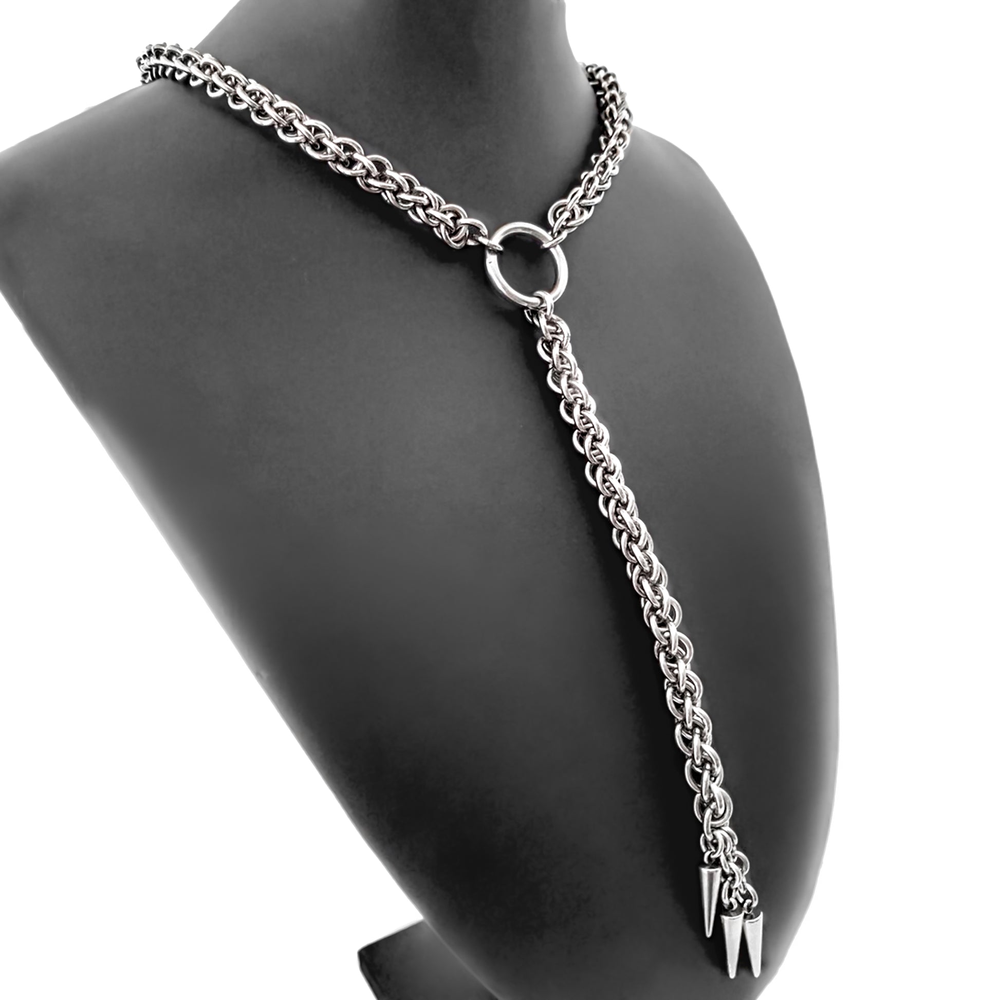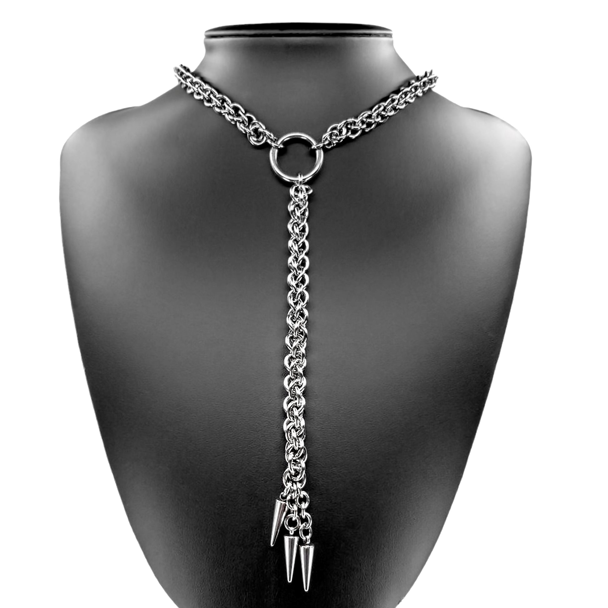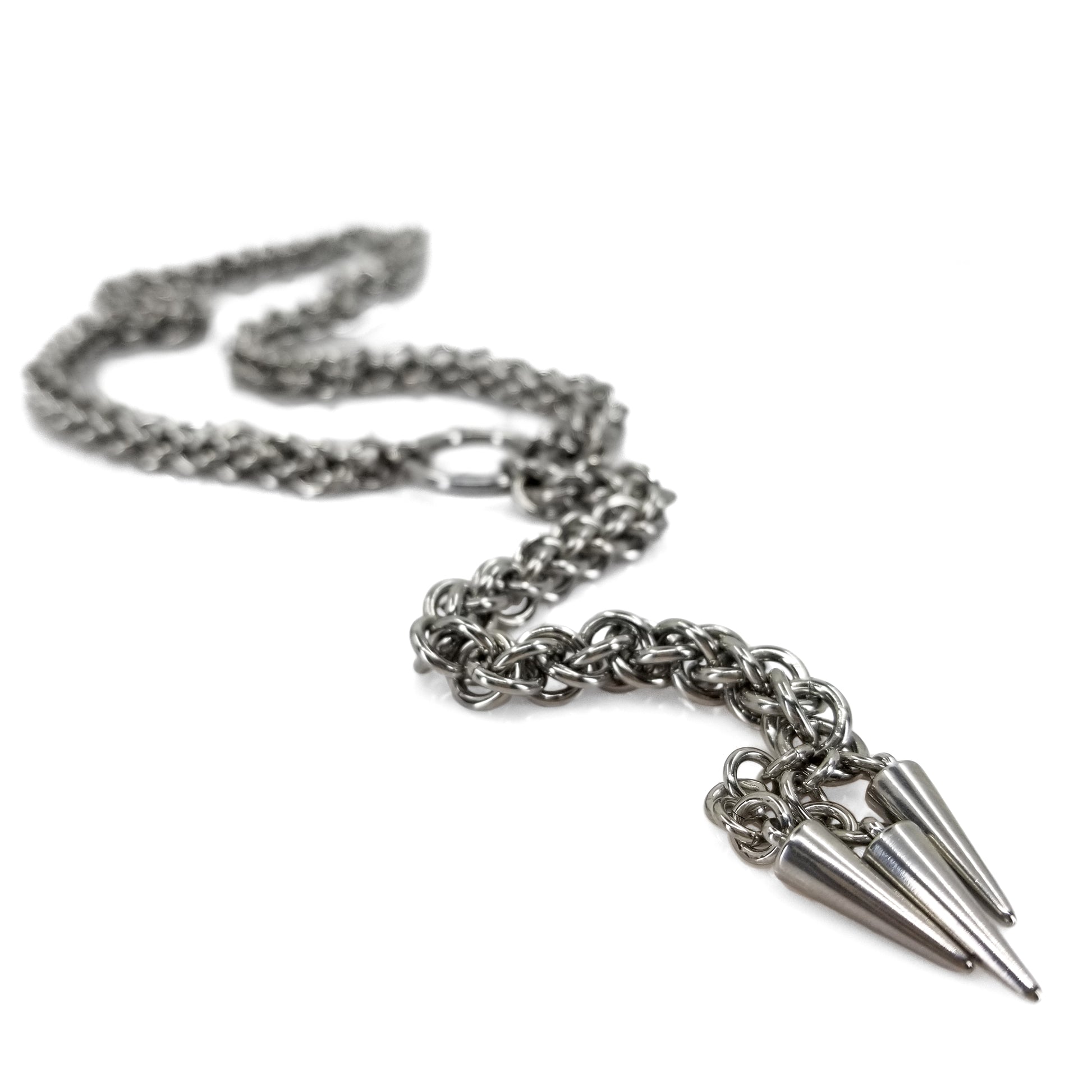 This 100% Stainless Steel chain has been woven into the Jens Pind Linkage chainmaille pattern using hundreds of stainless steel rings. The base chain connects to a solid stainless steel O ring and measures between 15"-19" depending on your choice . Another section of JPL3 chain and 3 stainless steel spike charms hang from the center O ring adding a 5 1/2" drop from the center ring. The chain clasps in the back with the use of a large stainless steel lobster claw clasp. (19" base chain is depicted in photo)