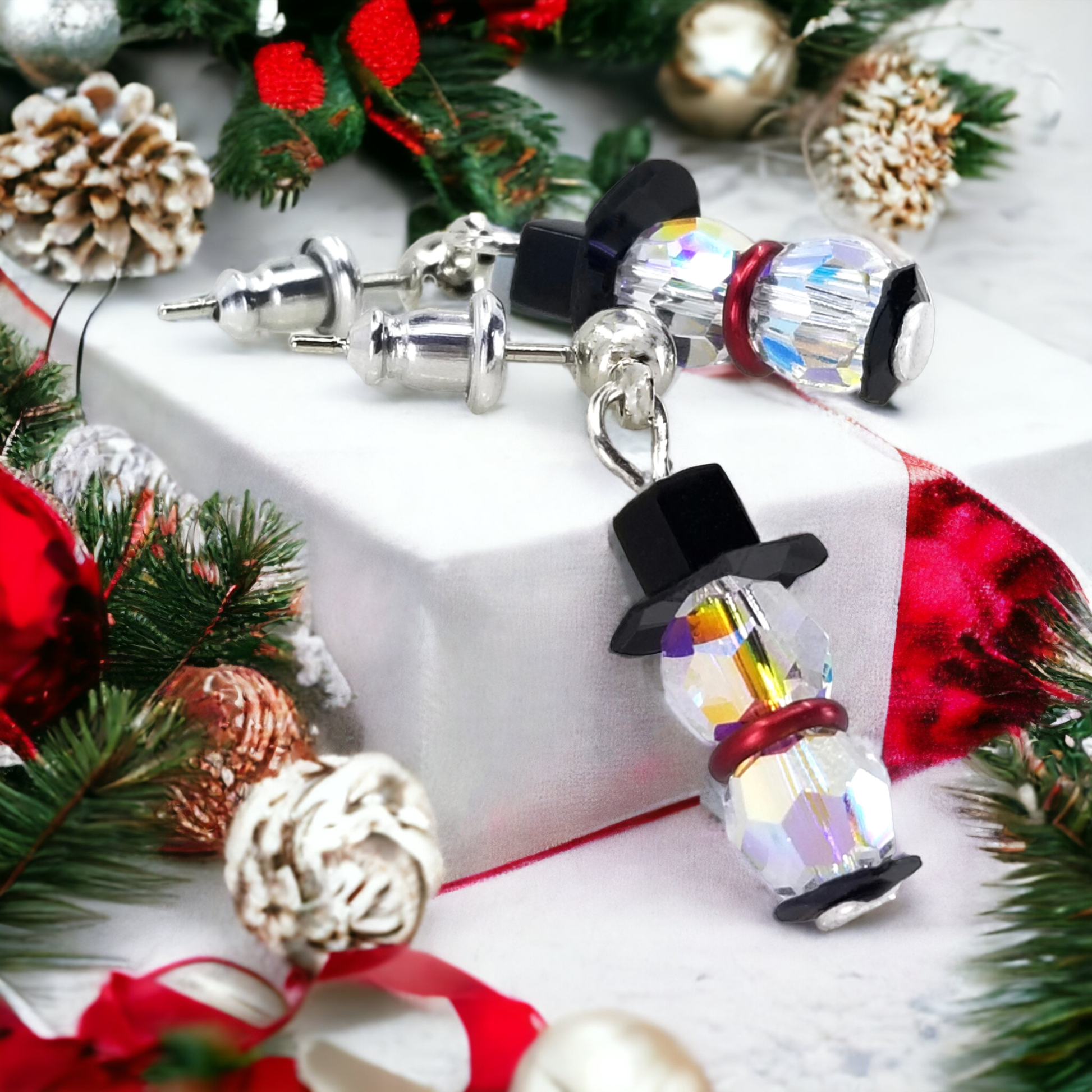 Fun, fun, fun! Gorgeous iridescent Aurora Borealis Swarovski Crystals sparkle and shine beneath a black opaque crystal top hat. Aurora Borealis crystals reflect a range of color in yellows, blues, reds and purples, making this Snowman a Holiday Sparkle favorite! The large and medium size come with an angular fishhook ear wire in stainless steel, and the small size comes with a stainless steel ball post with a stainless steel ear nut backing (no longer barrel backing).